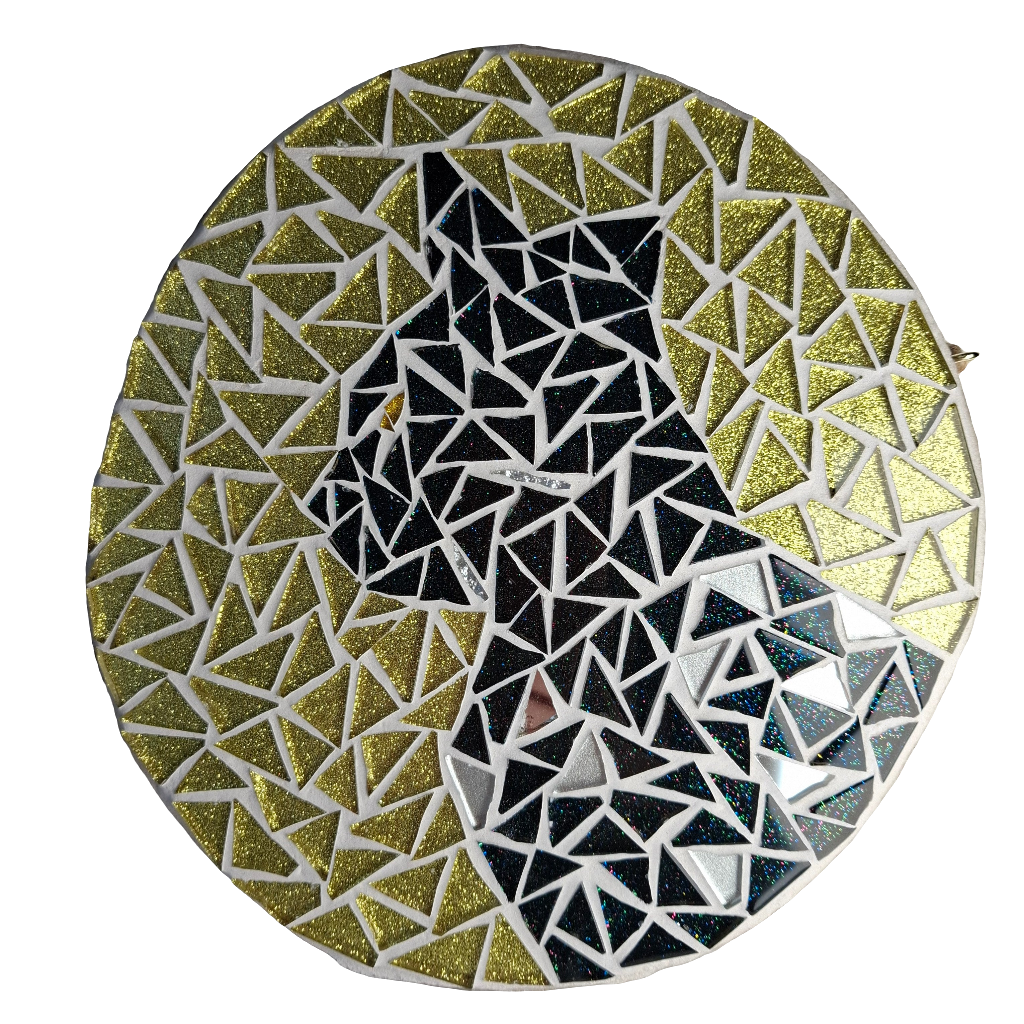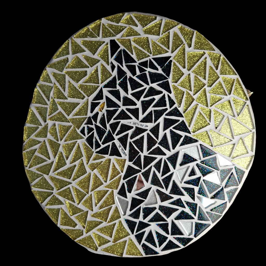 This black cat sparkles with black, silver and mirror tiles on a golden background.