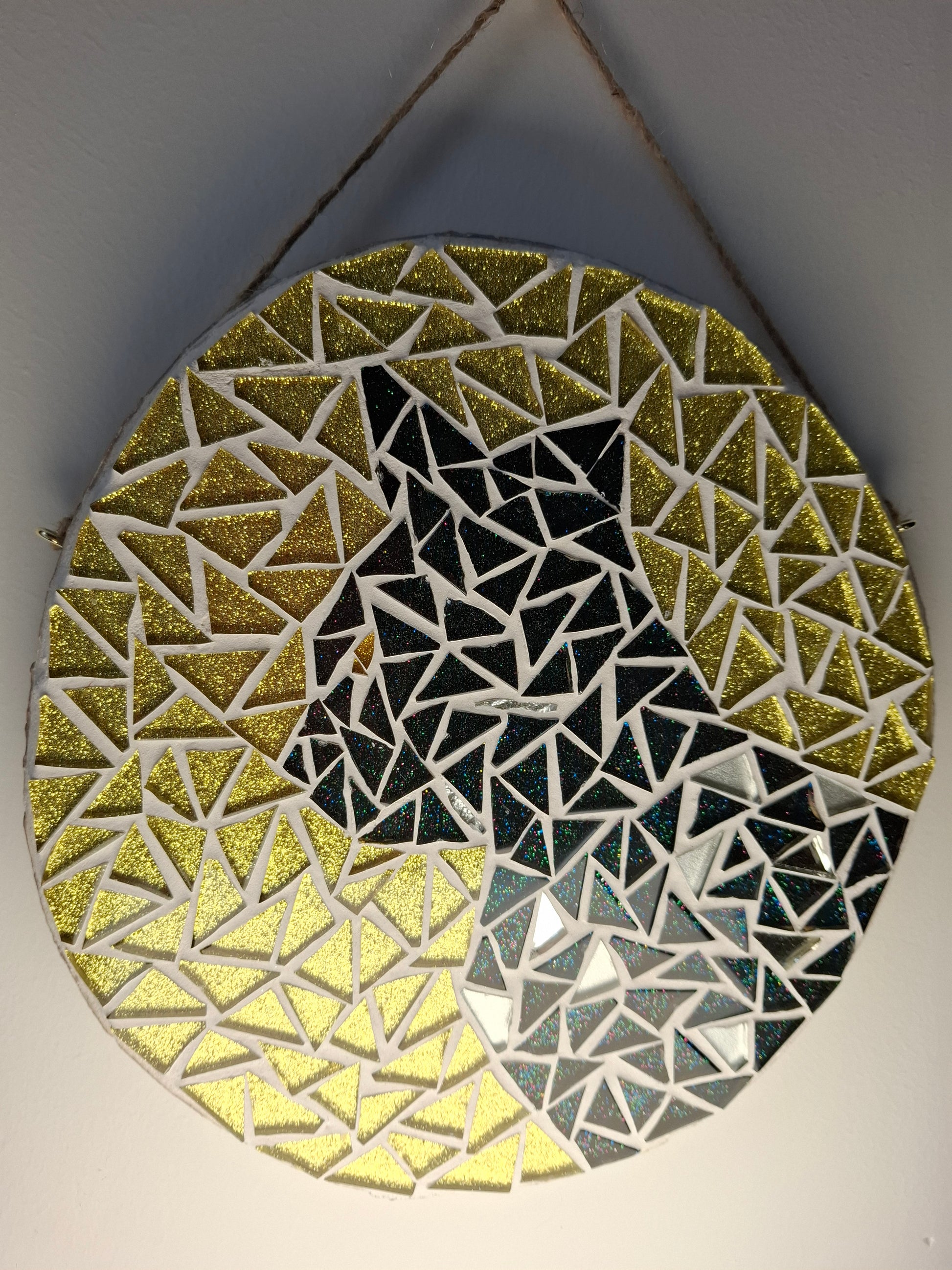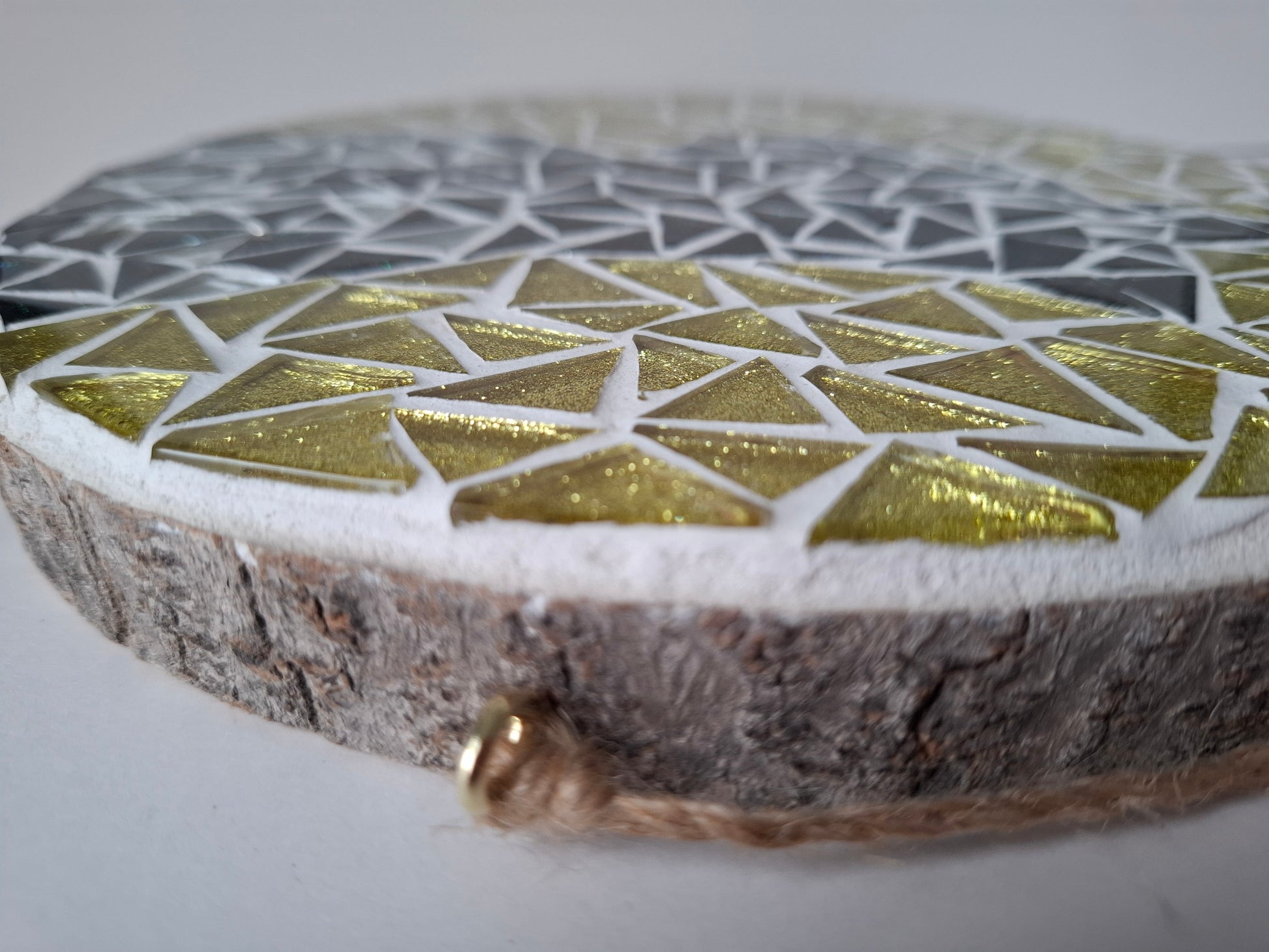 Original handmade mosaic artwork with glittery tiles on a wooden log slice.