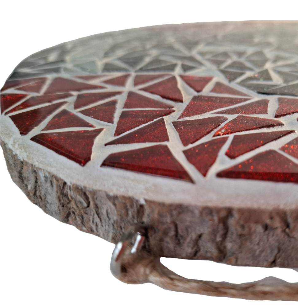 Handmade original mosaic artwork, using glittery tiles on a wooden log slice.