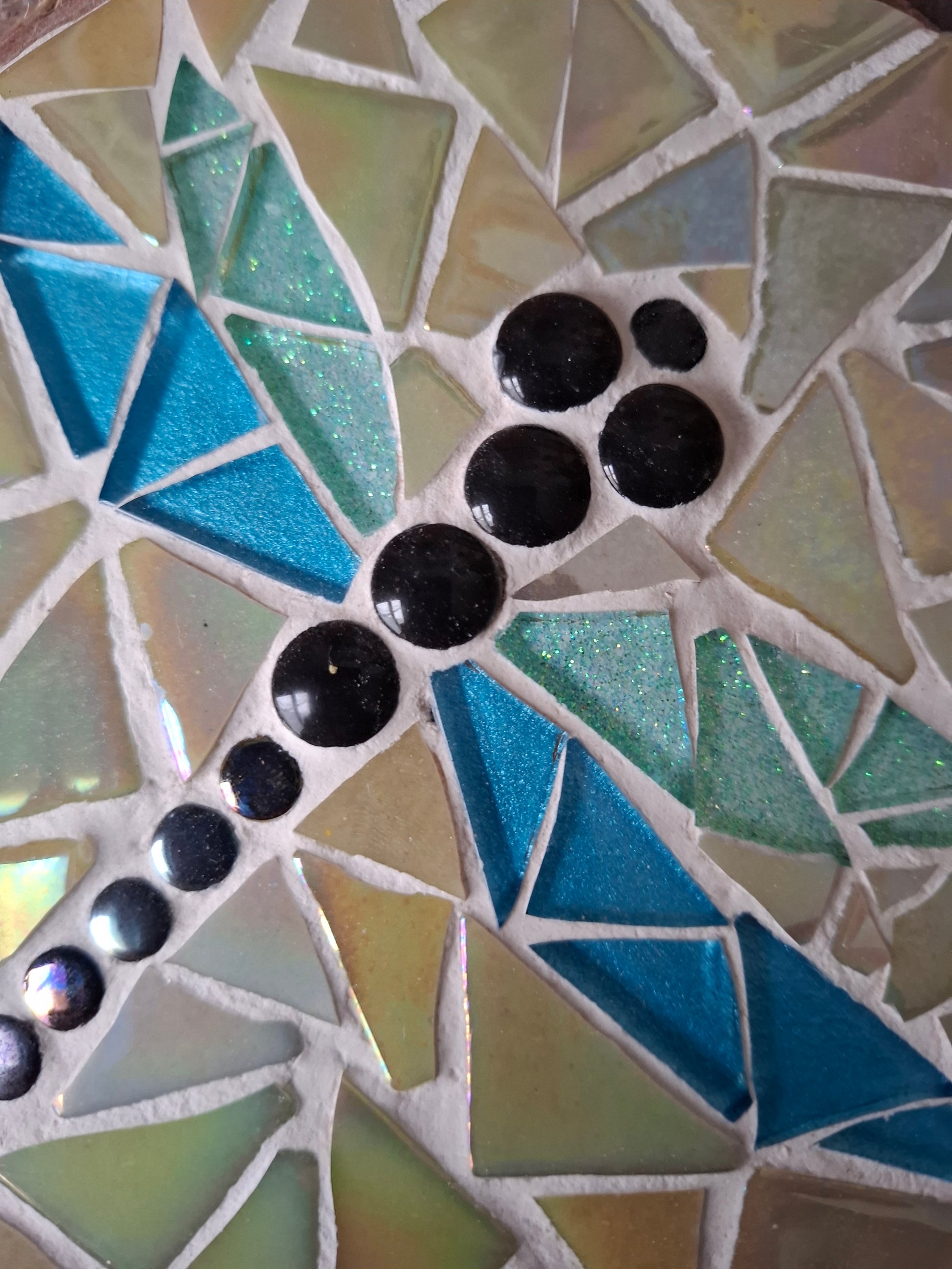 I am drawn to mosaic art through my appreciation of imperfection and uniqueness; something beautiful is created from broken pieces. This resonates because of my personal recovery from neurosurgery to remove a brain tumour, rebuilding my life and my health with a different version of me.