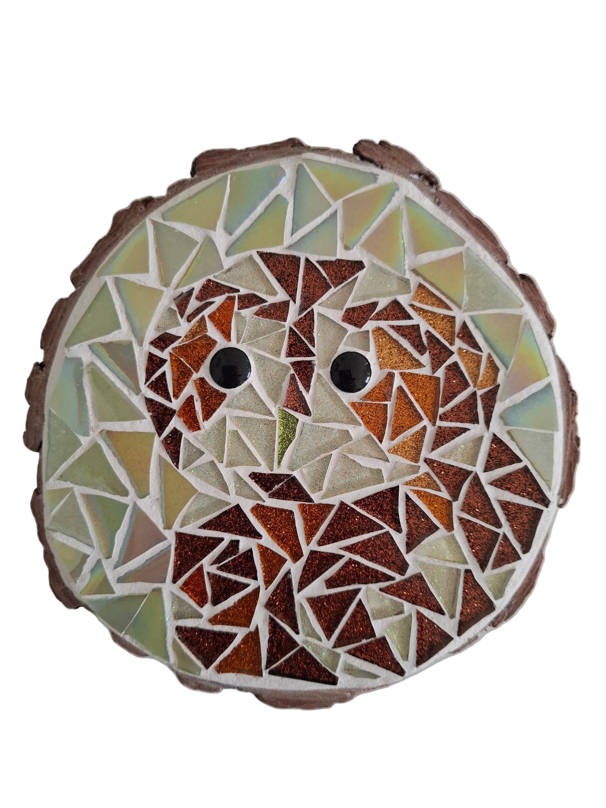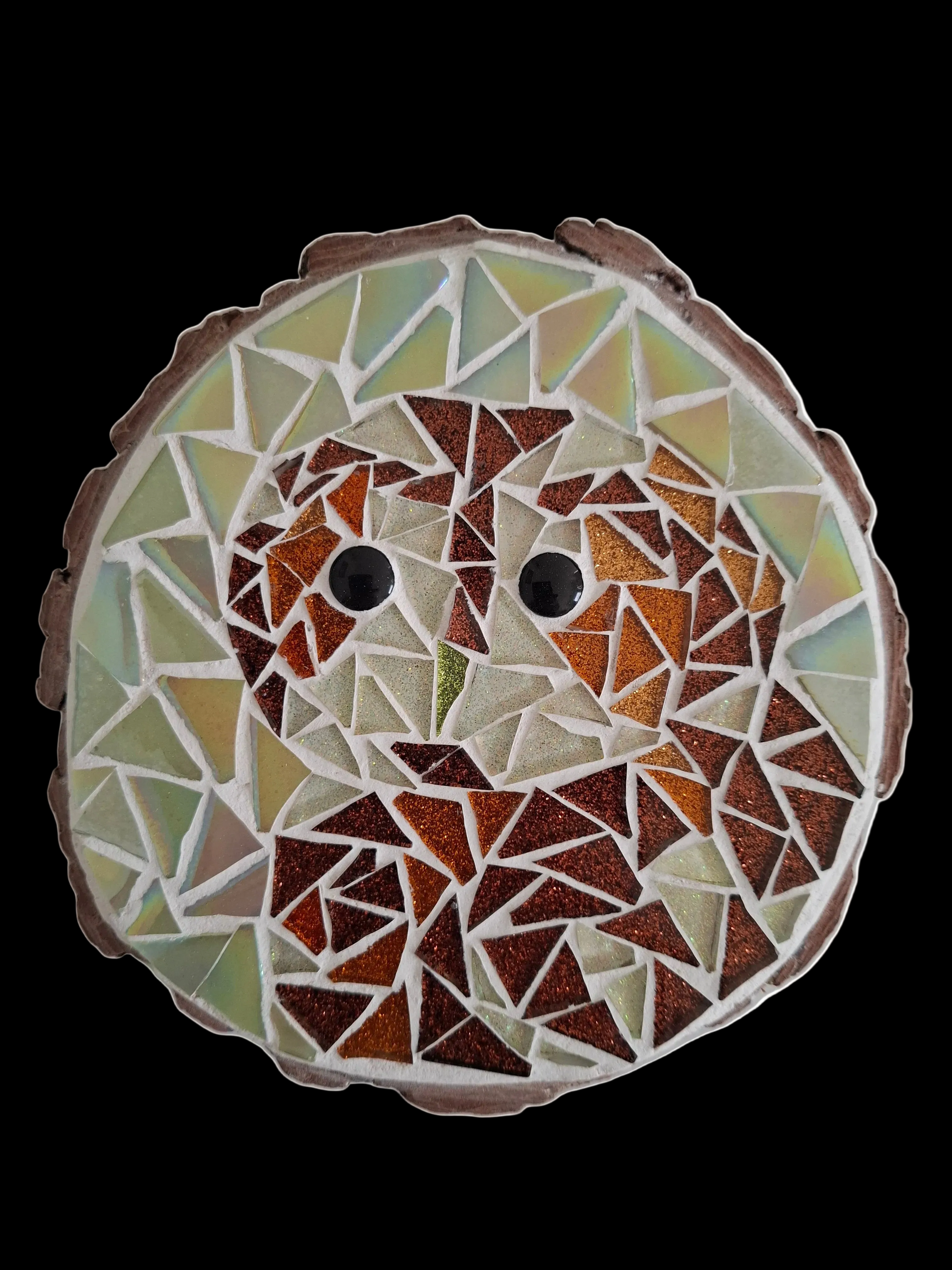 A bronze, brown and white tawny owl sparkles with glittery tiles on an iridescent green background.